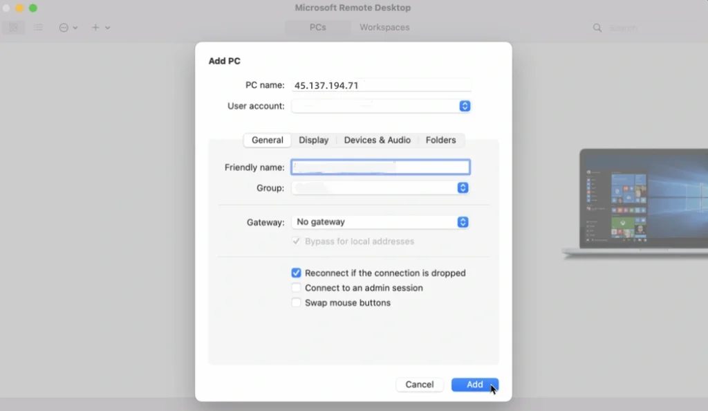 Type 45.137.194.71 in PC name, input the user name and password we provide, and then select Add.