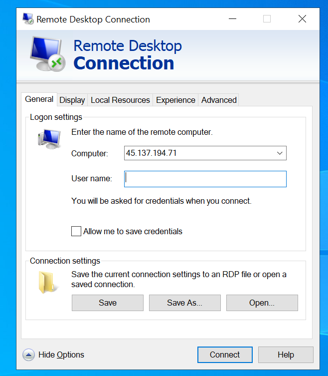 In Remote Desktop Connection, type 45.137.194.71, input the user name an password we provide, and then select Connect.